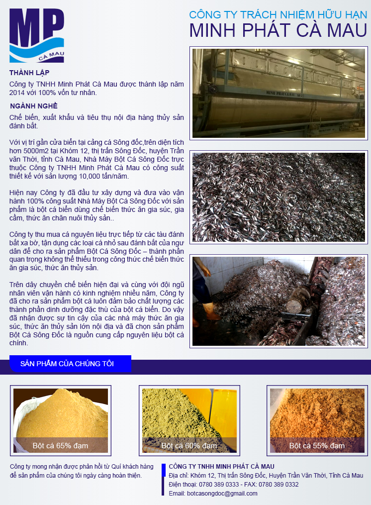 Với vị trí gần cửa biển tại cảng cá Sông đốc, trên diện tích hơn 5000m2 tại Khóm 12, thị trấn Sông Đốc, huyện Trần văn Thời, tỉnh Cà Mau, Nhà Máy Bột Cá Sông Đốc trực thuộc Công ty TNHH Minh Phát Cà Mau có công suất thiết kế với sản lượng 10,000 tấn/năm